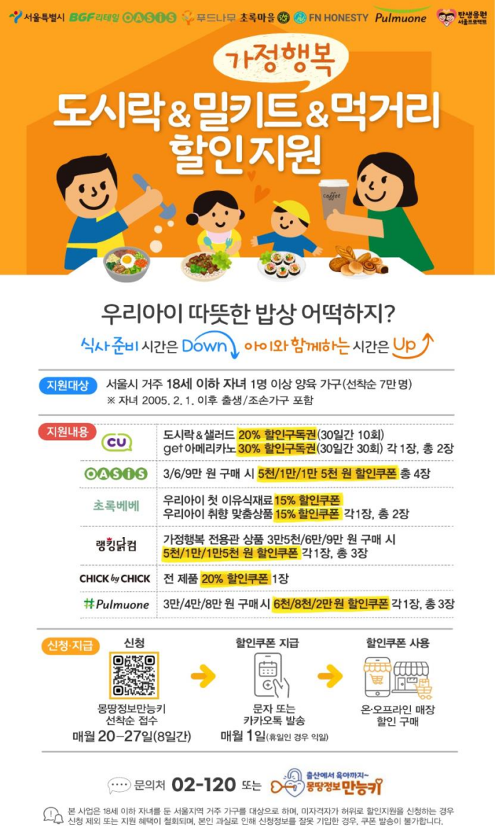 서울시에서는 저출생 대책 「탄생응원 서울 프로젝트 」의 하나로, 18세 이하 자녀가 있는 가정에서 식사 준비에 드는 시간과 비용을 절약할 수 있도록 ‘가정행복 도시락‧밀키트‧먹거리 할인지원 사업’을 올해 확대 추진한다고 밝혔다.