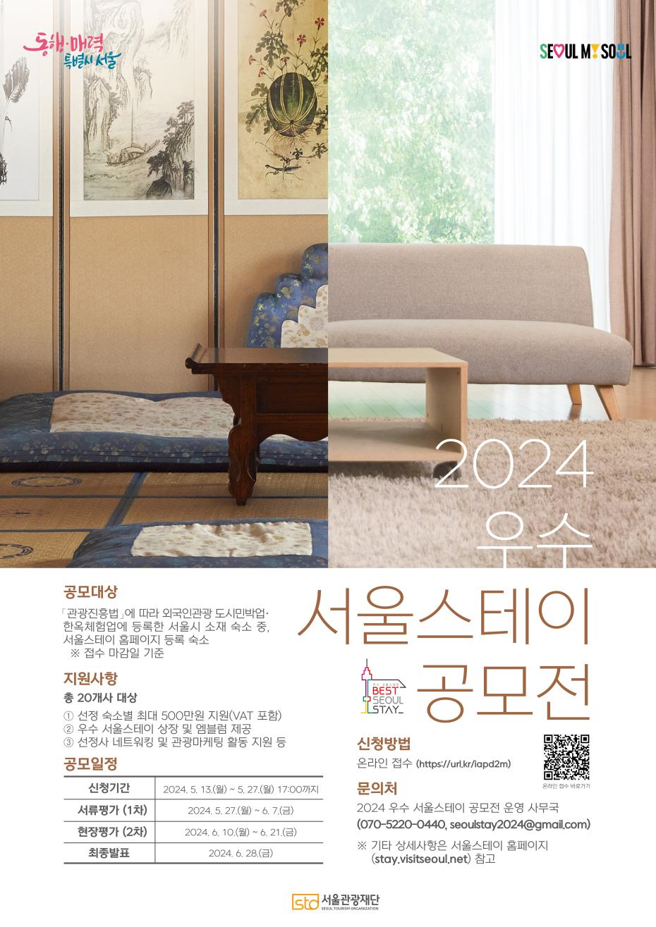 □ 서울시와 서울관광재단은 서울의 매력을 담은 우수한 숙박시설을 관광객들에게 선보이기 위해 5월 13일(월)부터 27일(월)까지 ‘2024 우수 서울스테이’ 공개모집에 나선다.