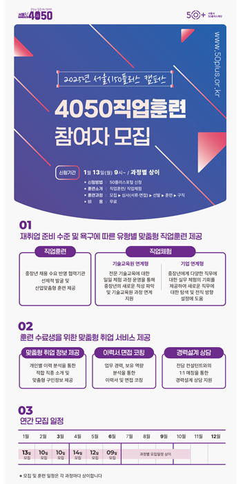– 취업 희망하는 서울 거주 중장년(40~64세)은 누구나, 1.13(월)부터 50+포털 통해 신청 가능