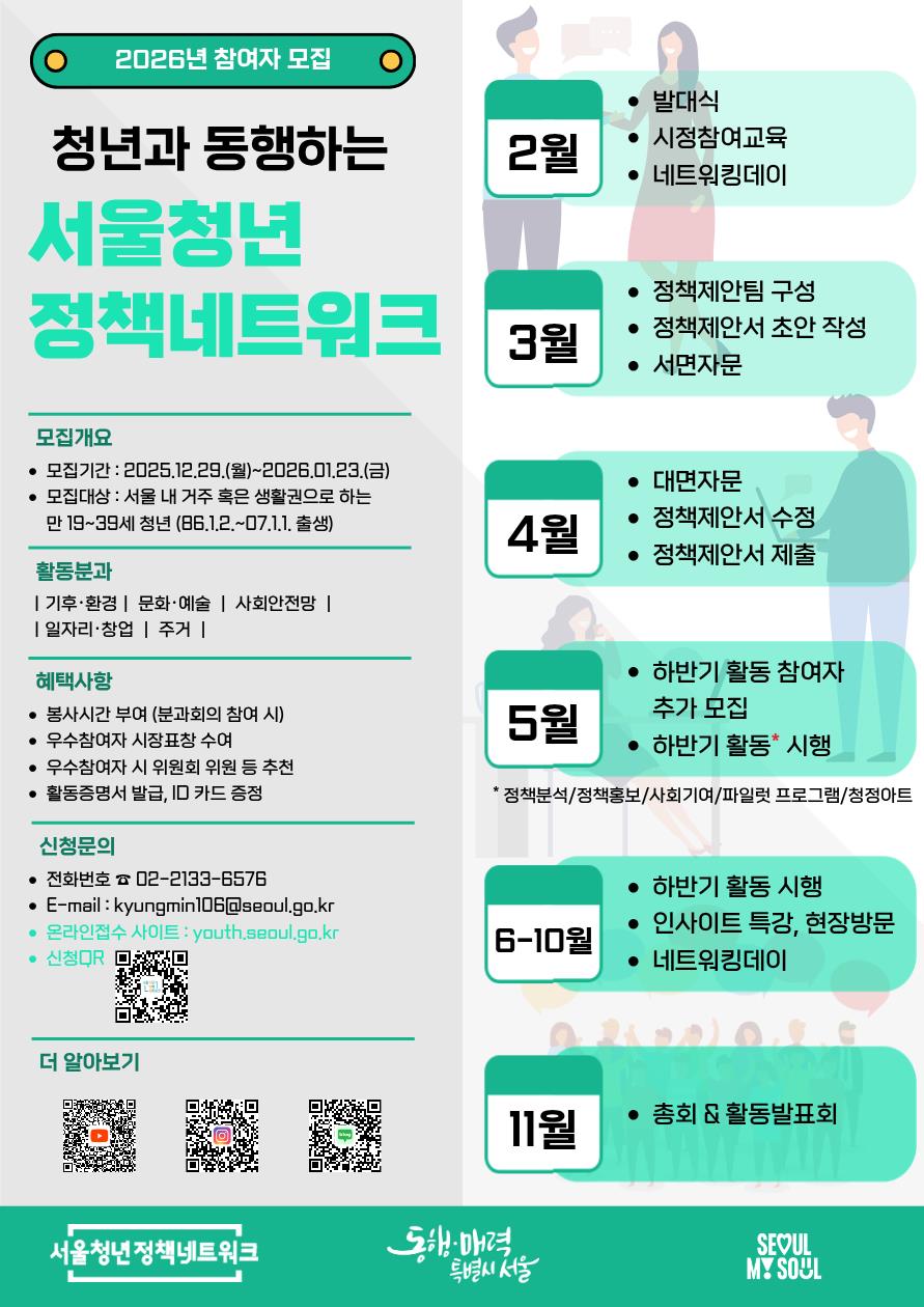 □ 서울시는 청년이 서울시정에 참여해 정책을 제안하는 서울청년정책네트워크(이하 ‘청정넷’) 신규 위원 350명을 모집한다. 신청기간은 2025.12.29.(월)부터 2026.1.23.(금)까지이고, 청년몽땅정보통(https://youth.seoul.go.kr)에서 접수를 받는다.
